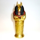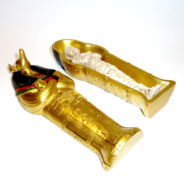 A great gift! Gilt reproduction of an Anubis mummy case complete with grisly mummy inside. Half human, half jackal, Anubis was associated with mummification and the afterlife in ancient Egyptian religion. Made of resin finished in bright gold with red, blue and black highlights. Not suitable for small children.