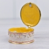 Gorgeous little round enamelled metal trinket box with a pair of pink ballet shoes on top. Orange enamelled interior.