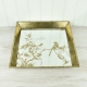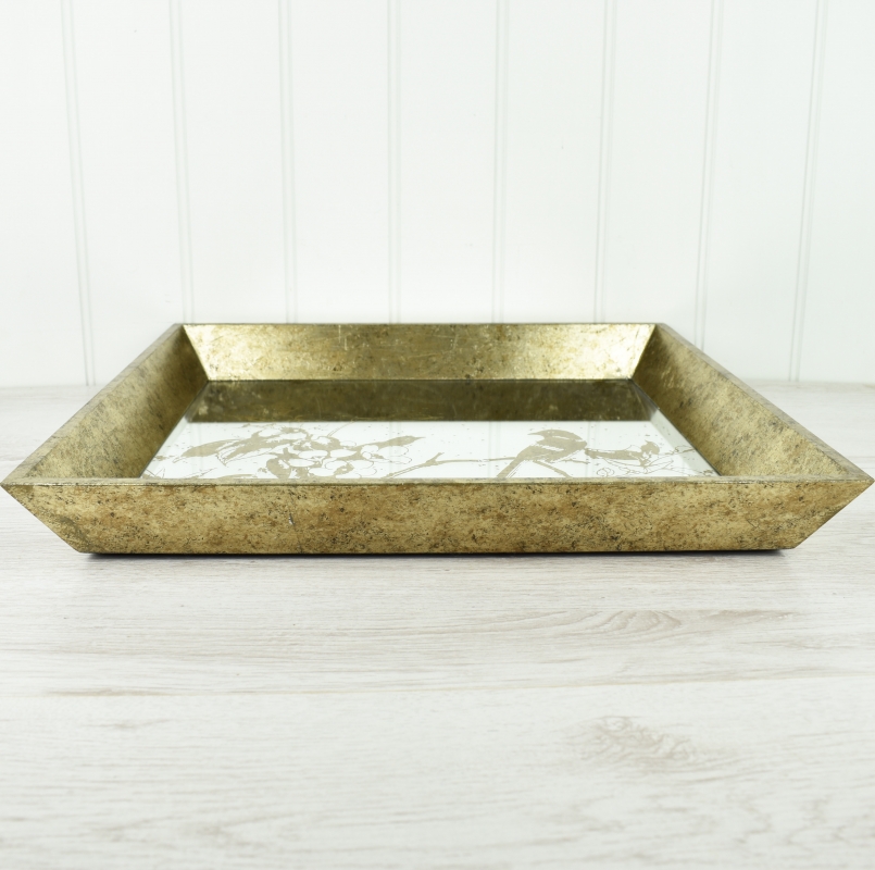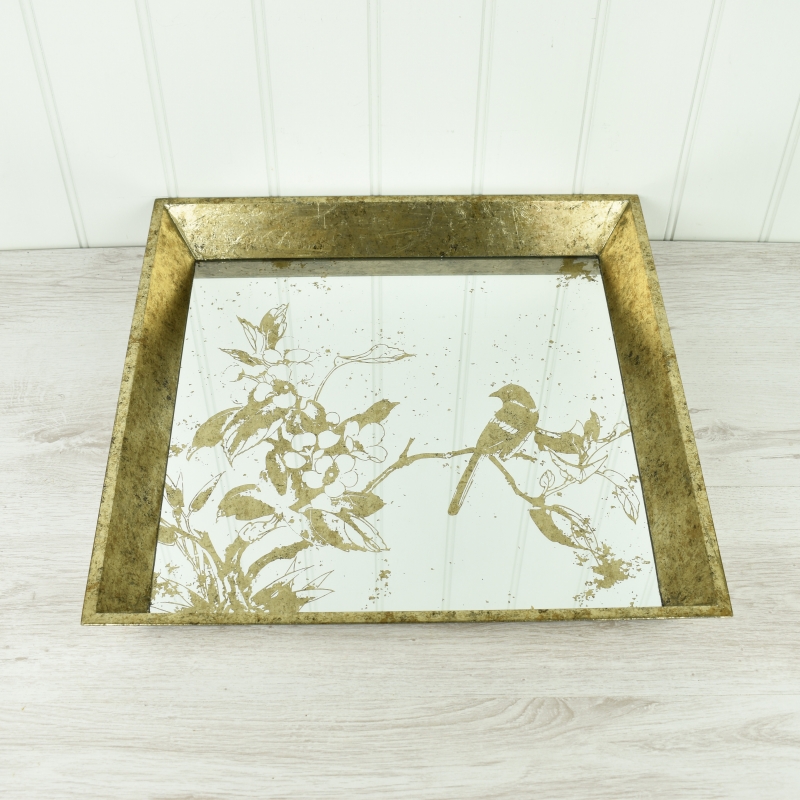 Substantial square mirror tray adorned with birds on flowers. Gold sides and trim with black felted base.