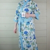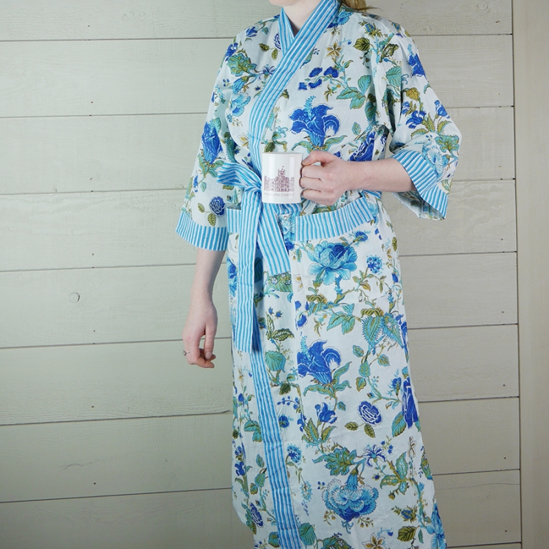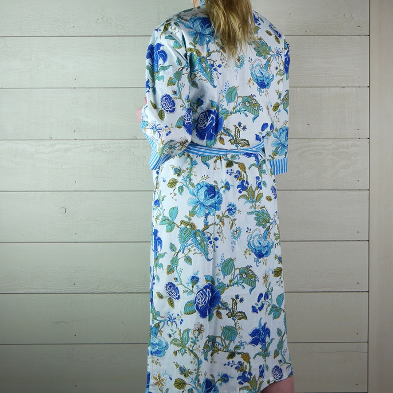 Long kimono style cotton dressing gown, generously cut with a tie belt and two patch pockets. White background with blue striped trim. Machine wash at 40 degrees. Fits sizes 8-16. 100% cotton.