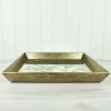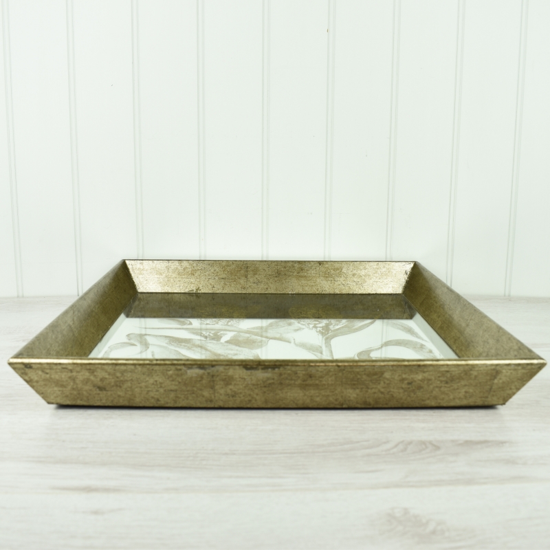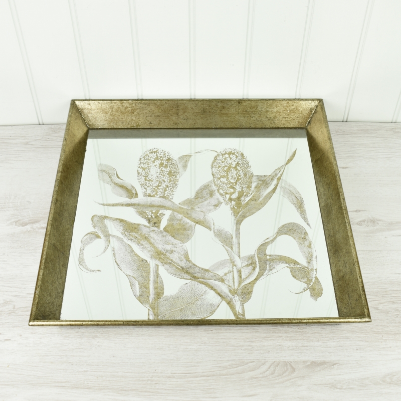 Substantial square mirror tray adorned with a botanical design. Gold sides and trim with black felted base.