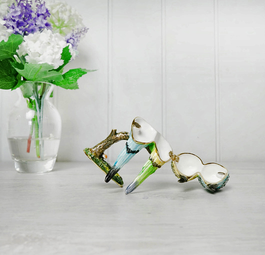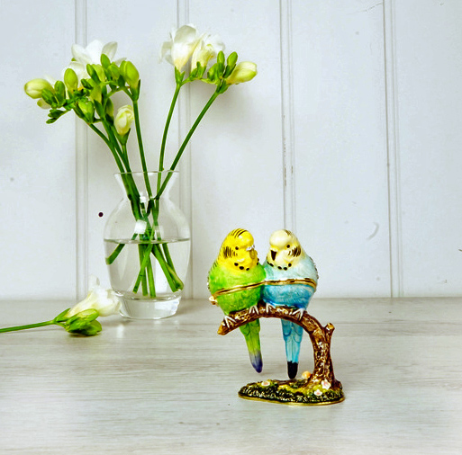 Gorgeous trinket box in the shape of a pair of budgerigars on a perch. The birds open to show a cream interior. Enamelled metal.