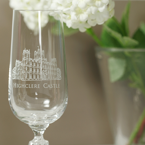 A pair of Crystal champagne flutes etched with the outline of Highclere Castle in a presentation box