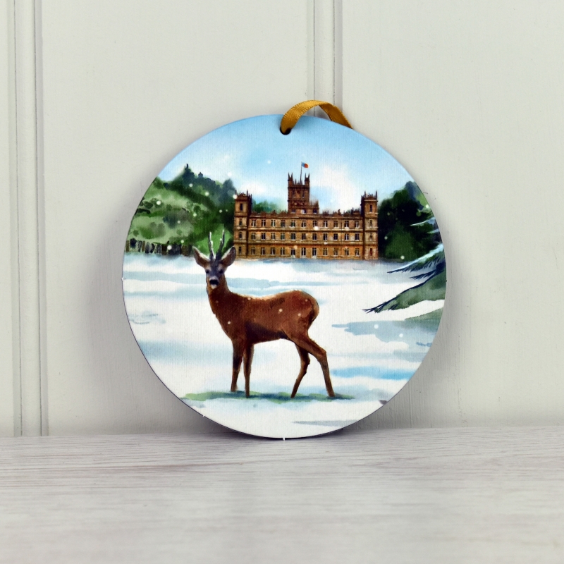Lovely Christmas card featuring Highclere Castle in the background. In the foreground a deer stands on the snowy lawn. The deer and the Castle pop out of the card to become a wonderful hanging decoration perfect for any Christmas tree.