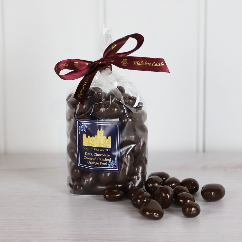 Dark chocolate covered candied orange peel in a cellophane bag tied with Highclere Castle ribbon. 225g net weight