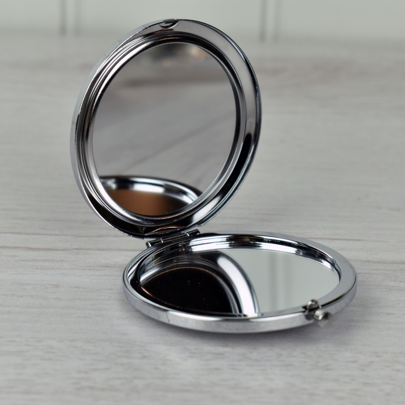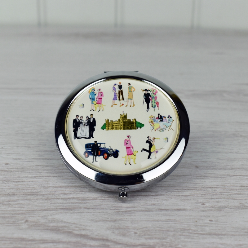 Good quality handbag sized compact mirror. Decorated on one side with our signature Downton Abbey style print with the outline of the castle and the name Highclere Castle printed on the reverse. Contains 2 mirrors, one ordinary and one a magnifying mirror.
