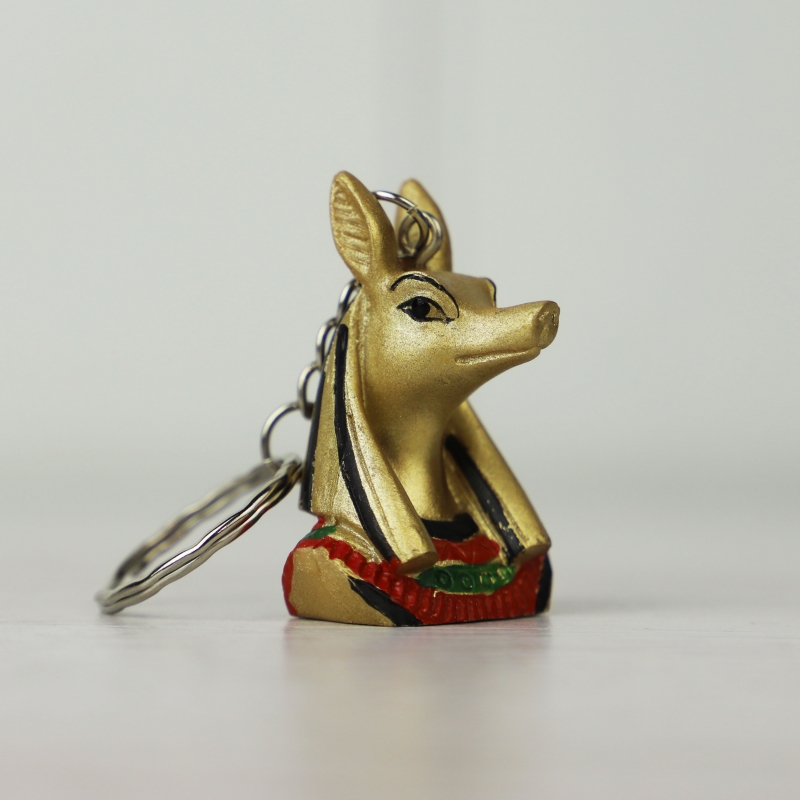 Gilt painted Egyptian figure of Anubis the Jackal (head), designed in a detailed realistic style, on metal key chain. Made of gold coloured resin with blue, red and black accents as appropriate.