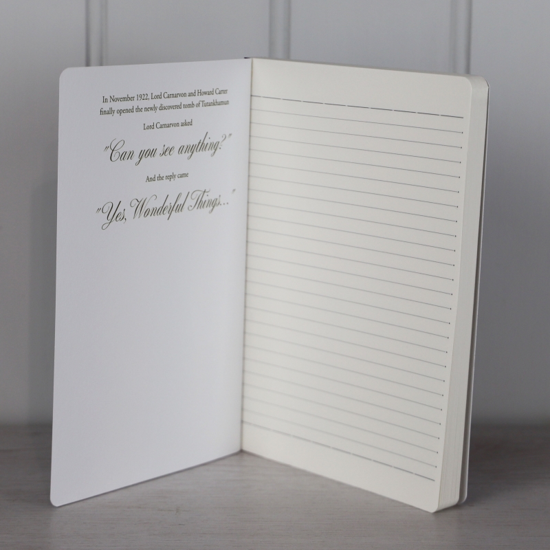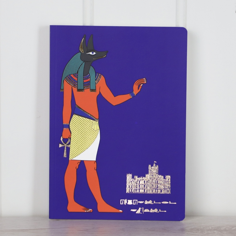Soft back lined notebook. The cover is in a vivid "Egyptian" blue illustrated with a large Anubis printed and has the name Highclere castle in hieroglyphics.