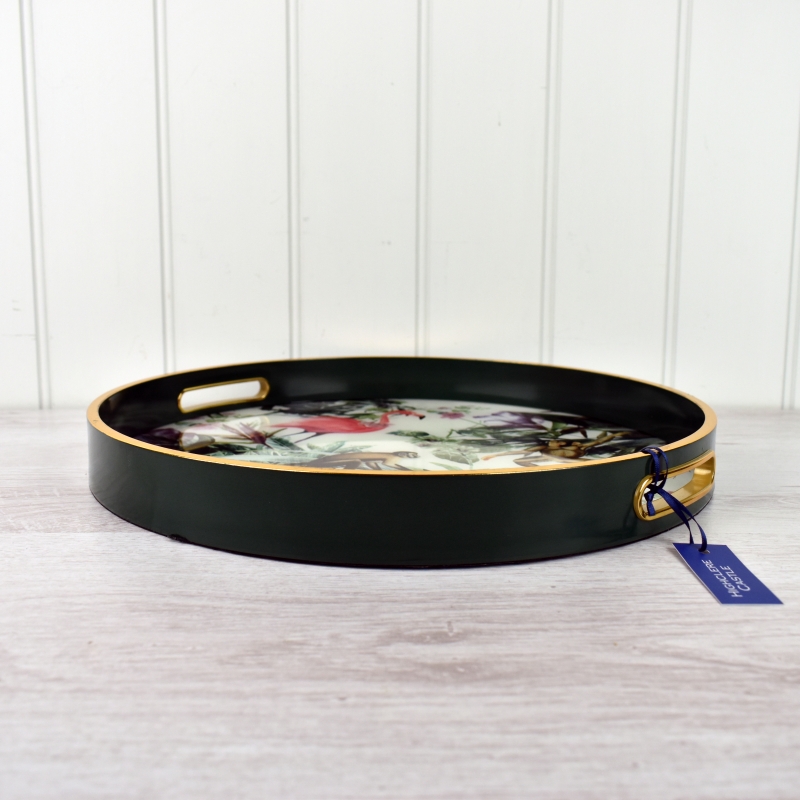 Substantial and stylish tray with a jungle design of a flamingo and monkeys on a cream background. Dark green sides with gold rimmed integral handles. Felt base with rubber anti slip pads.