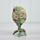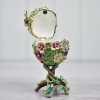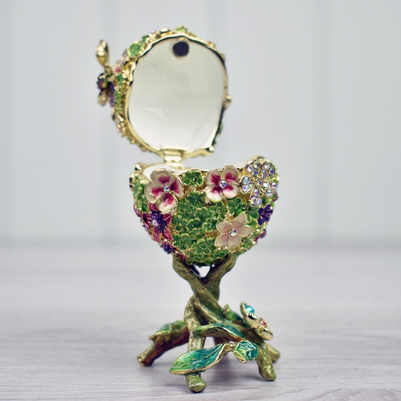 Pretty trinket box in the shape of a flower covered egg in a leaf entwined stem with a butterfly and bee. Diamante accents and a white enamelled interior. Not suitable for small children.