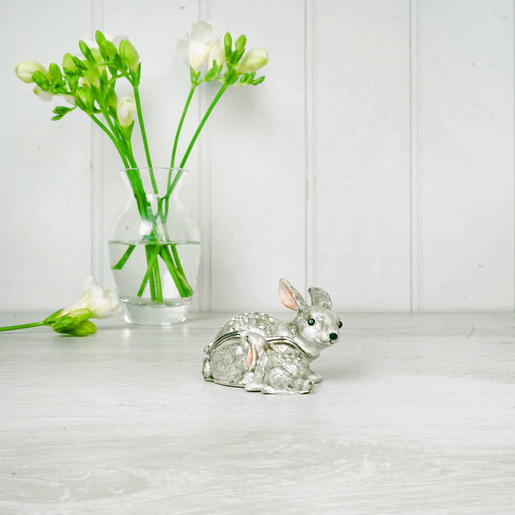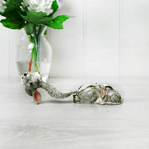 Gorgeous trinket box in the shape of a grey rabbit with baby. The mummy rabbit opens to reveal a cream interior. Enamelled metal.