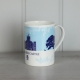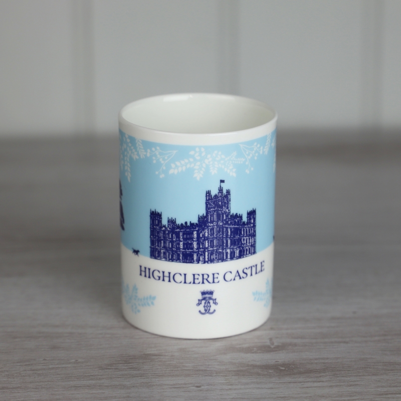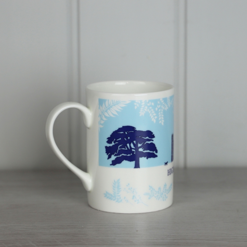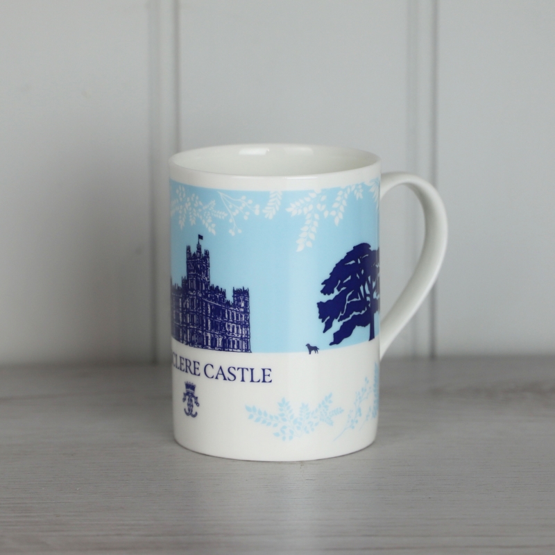 Bone China mug with our new Highclere Castle deisgn of a deep blue outline of Highclere Castle and the silhouette of a Cedar tree against a soft blue background. Unboxed to save packaging waste.