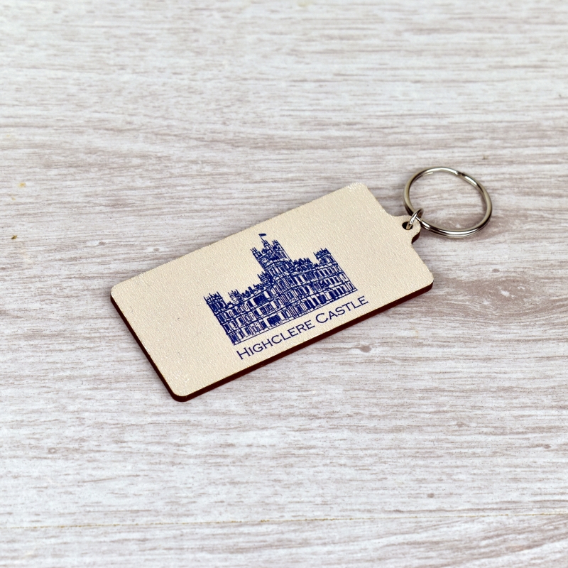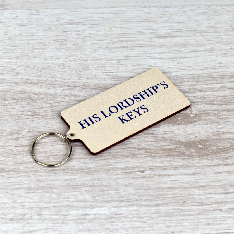 A wooden keyring printed with a picture of Highclere Castle on one side and the words " His Lordship's Keys " on the other.