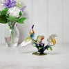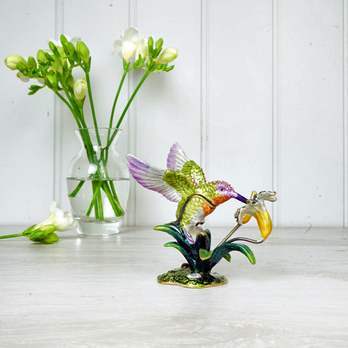 Gorgeous trinket box in the shape of a hovering hummingbird dipping into a flower. The hummingbird opens to reveal a blue interior. Enamelled metal.