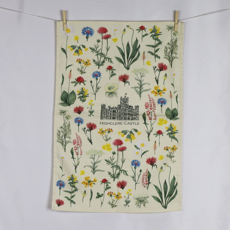 Tea Towel decorated with our wild flower meadow design which shows many of the wildflowers growing in Highclere's wild flower meadow. 100% cotton. Machine washable.