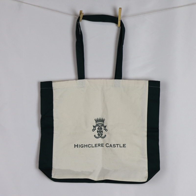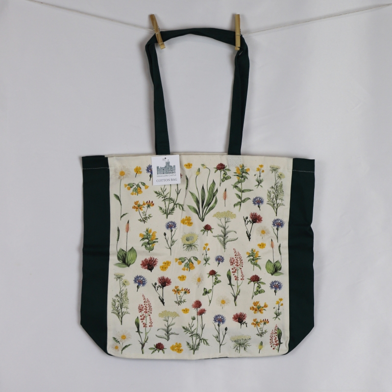 Cotton canvas tote bag decorated with our wild flower meadow design which shows many of the wildflowers growing in Highclere's wild flower meadow. On the other side there is the Earl of Carnarvon’s coronet and crest. With a dark green gusset, it is strong enough to fill with your heaviest items.