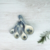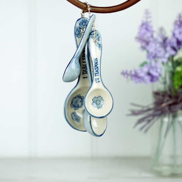Pretty set of measuring spoons in a blue and white design. There are 4 spoons in all: 1 tablespoon, 1 teaspoon, 1/2 teaspoon, 1/4 teaspoon. Dishwater safe.