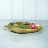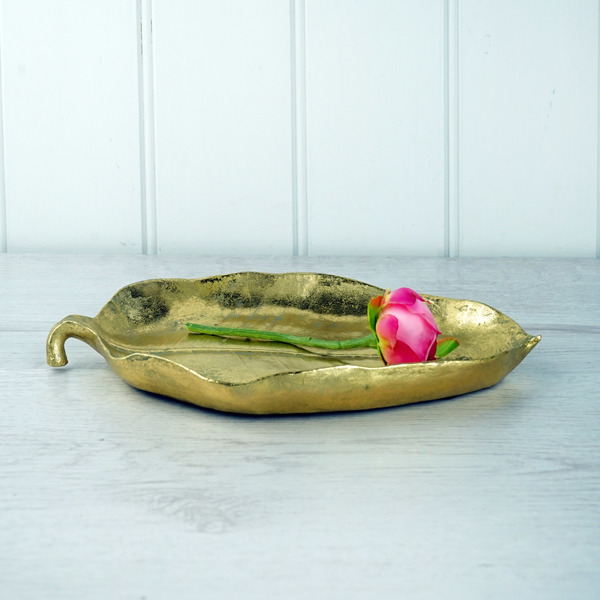 Little gold boudoir tray in the shape of a leaf. Slightly distressed finished with rubber anti-slip pads. Resin.