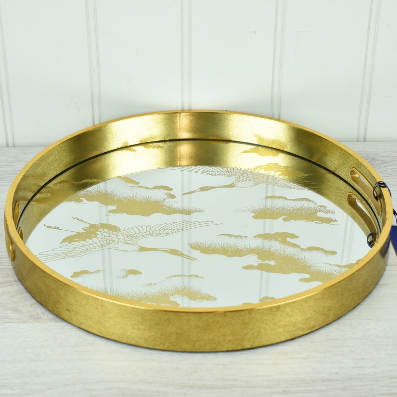 Laquered circular tray with cranes flying on a mirrored background. Gold edges, integral handles with a black felt base and rubber anti-slip pads.
