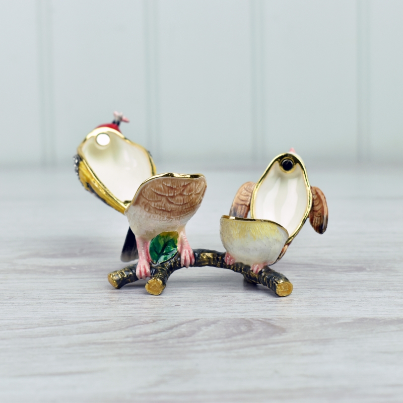 Pretty trinket box in the shape of a goldfinch and chick on a branch. White enamelled interior. Not suitable for small children.