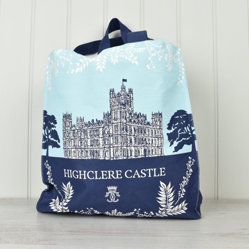 Cotton canvas tote bag decorated with our navy blue and turquoise design showing the iconic profile of Highclere Castle on both sides. With a gusset following the pattern it is strong enough to fill with your heaviest items.
