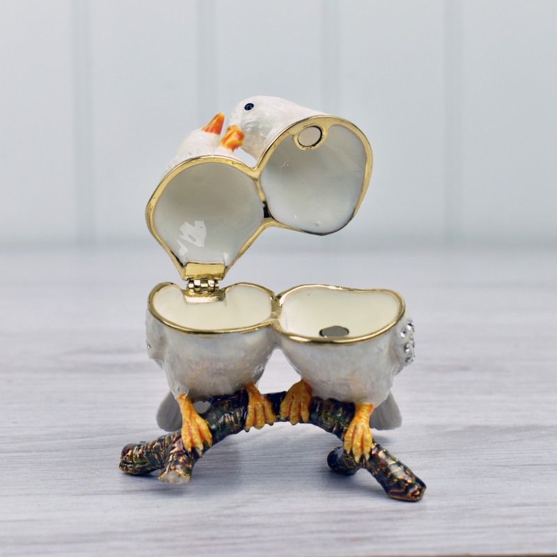 Substantial trinket box in the shape of a pair of doves on a branch. White enamelled interior with diamante accents. Not suitable for small children.