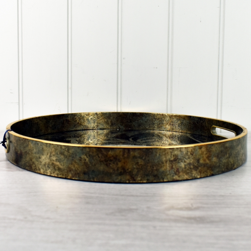 Substantial and stylish antiqued gold tray with a palm tree design on a black glass base. Antiqued gold sides. Felt base with rubber anti slip pads.