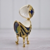 Gorgeous trinket box in the shape of a rich blue, gold and diamante egg on an integral stand. The front of the egss has a picture of a peacock in a frame. White enamelled interior.