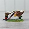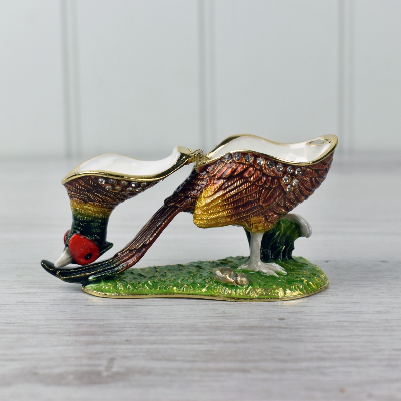 Enamelled metal trinket box in the shape of a pheasant. White enamelled interior. Not suitable for small children.