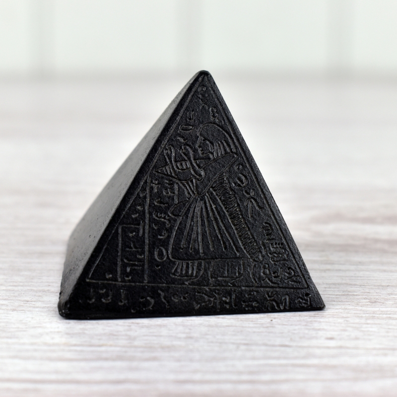 Small black pyramid decorated with Egyptian motifs on two sides. Made of resin.