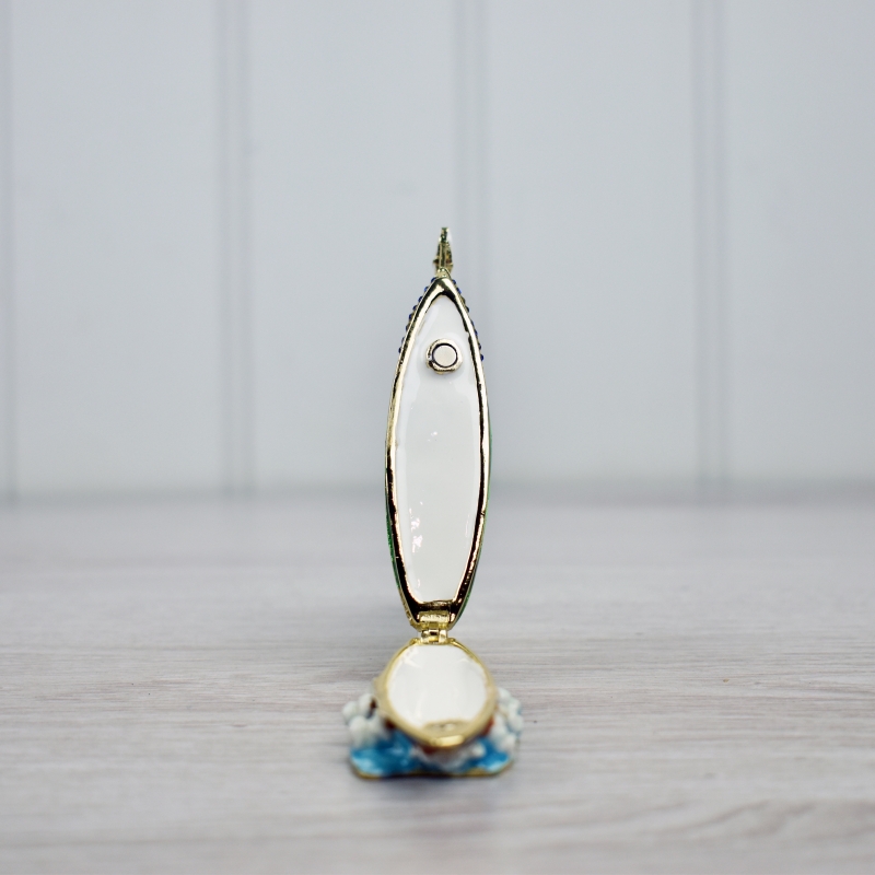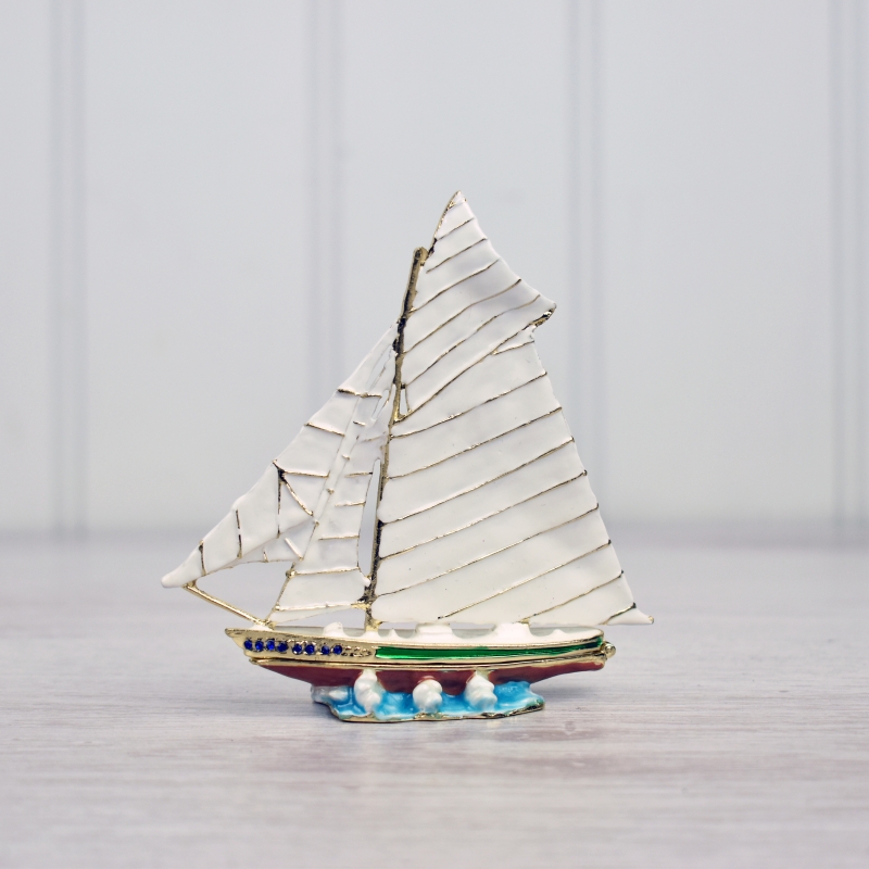 Enamelled metal trinket box of a sailing yacht in full sail. Blue diamante accents and a white enamelled interior.