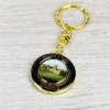 A Round metal keyring with a free spining center, contains a picture of the castle on one side and the Carnarvon crest on the other.