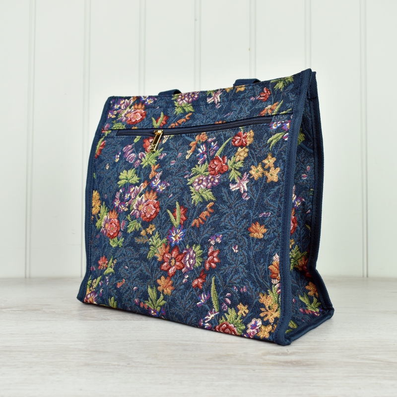 Attractive and practical shopper style bag in a tapestry fabric. Fully lined with an inside zipped pocket and a zip closure. On the oustide, one side has a velcro pocket and the other a further zipped pocket. Sturdy canvas style straps are long enough to be able to use it as a shoulder bag.