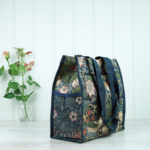Attractive and practical shopper style bag in a tapestry fabric. Fully lined with an inside zipped pocket and a zip closure. On the oustide, one side has a velcro pocket and the other a further zipped pocket. Sturdy canvas style straps are long enough to be able to use it as a shoulder bag.