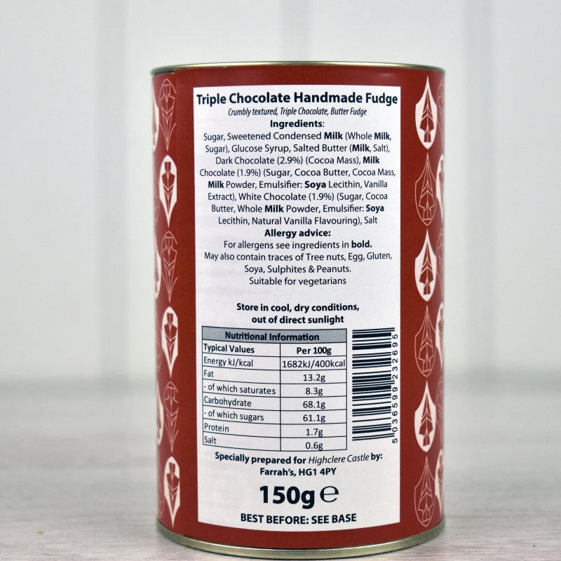 Crumbly textured handmade triple chocolate butter fudge. Contents 150g.