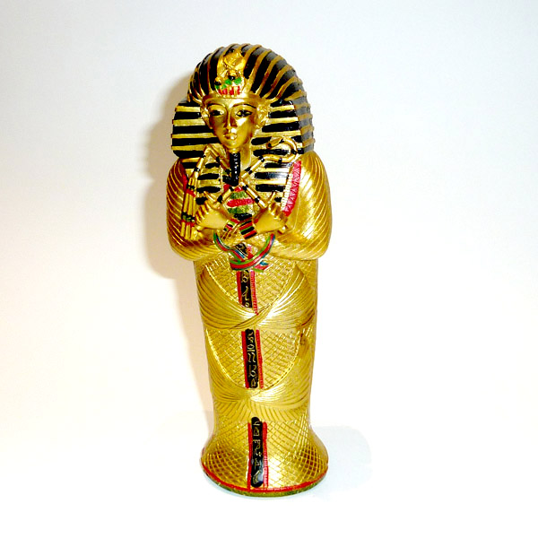 A gilt reproduction of the gold mummy case of Tutankhamun which was discovered by Howard Carter and the 5th Earl of Carnarvon in 1922. Comes complete with grisly mummy inside. Made of resin finished in bright gold with red, blue and black highlights. Not a toy. Avaialble in two sizes, this is the larger version.