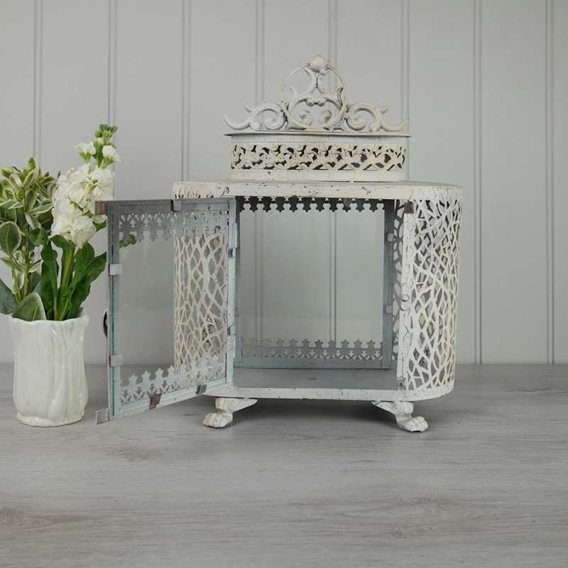 Pretty and substantial feeling white painted metal lantern with a glass front and back to protect the candle (not included). Shabby chic style with light distressing.